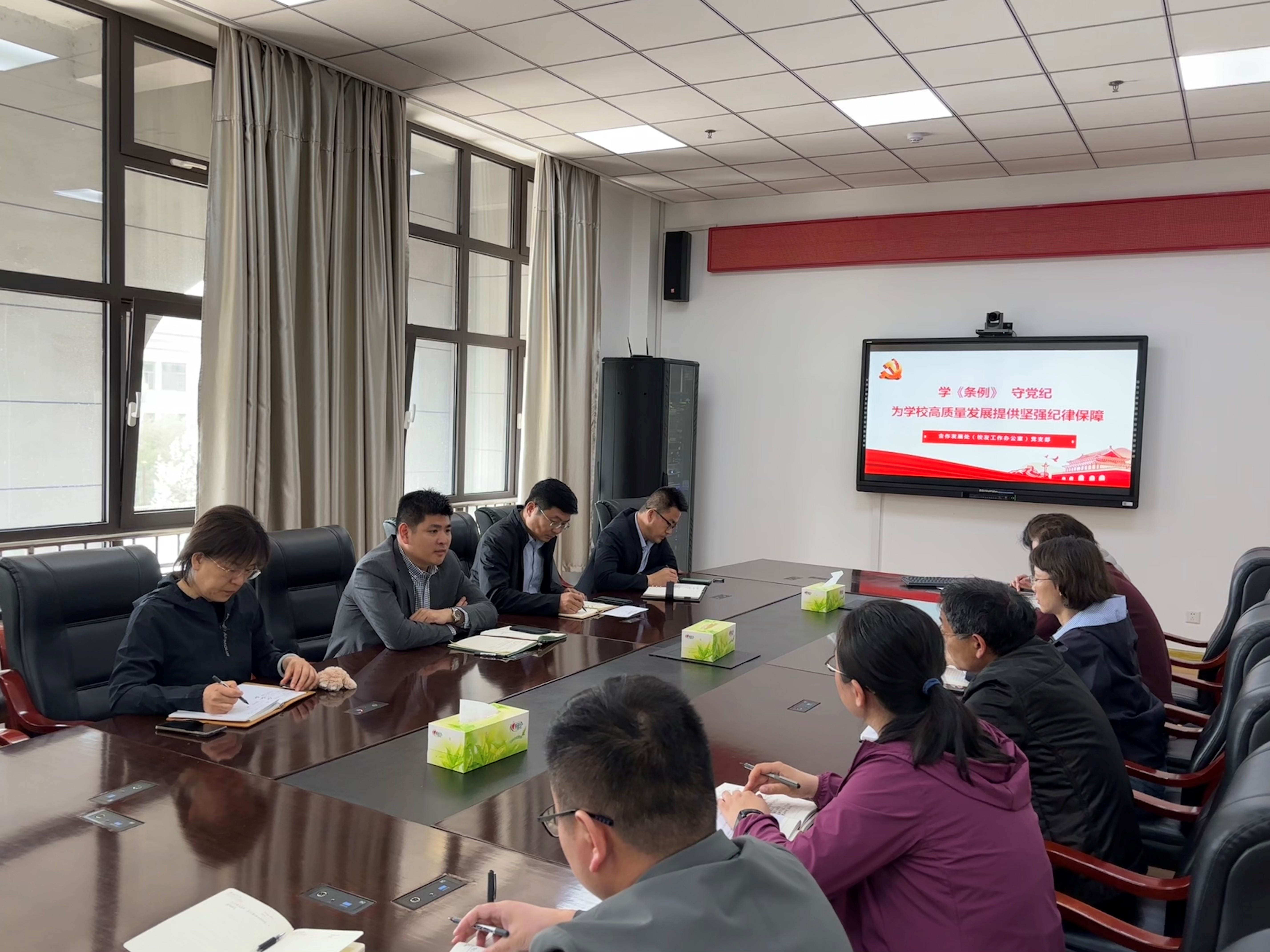 4月30日上午,合作发展处(校友工作办公室)党纪学习教育读书班在综合服务楼2015会议室举行,深研细读新修订的《中国共产党纪律处分条例》,推动党纪学习教育走深走实。