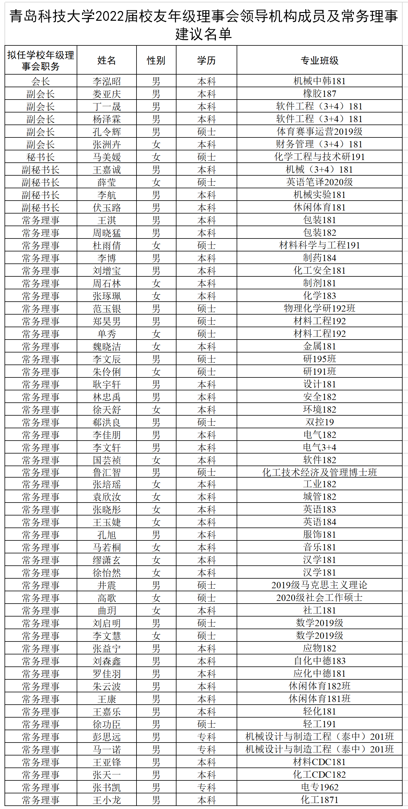 按照《关于成立BB贝博艾弗森官方网站2022届校友年级理事会的通知》精神和《BB贝博艾弗森官方网站校友年级理事会工作实施办法》,经各学院(校区)、校团委和校学生会、校研究生会推荐,学校校友总会研究决定,拟确定以下同学为BB贝博艾弗森官方网站2022届校友年级理事会领导机构成员与常务理事。现将有关情况公示如下: