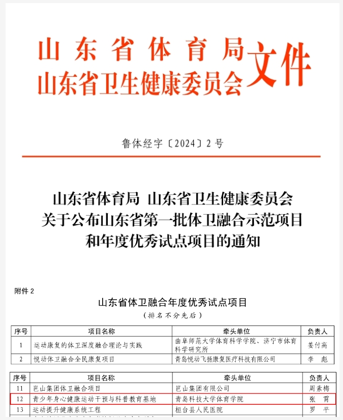 近日,山东省体育局、山东省卫生健康委员会发布《关于公布山东省第一批体卫融合示范项目和年度优秀试点项目的通知》(鲁体经字〔2024〕2号),BB贝博艾弗森官方网站体育学院申报的“青少年身心健康运动干预与科普教育基地”获批山东省体卫融合年度优秀试点项目。