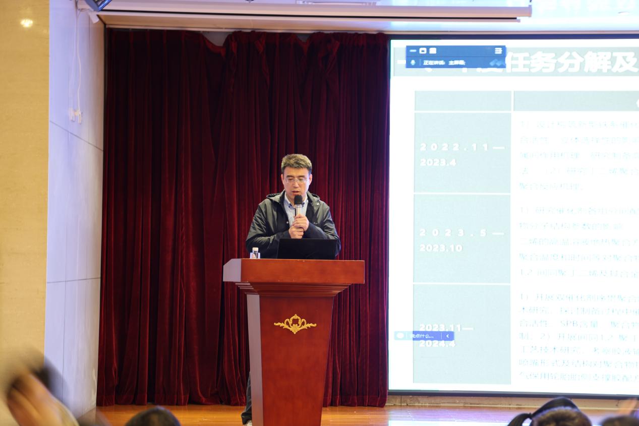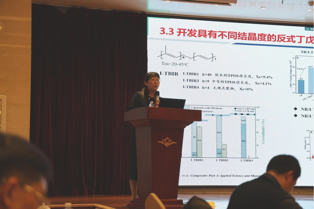 张春雨教授向大会汇报了“1,2-间同聚丁二烯橡胶制备关键技术和应用研究”课题的研究成果。团队成功开发了高效催化剂,最高活性达18.86 kg/gFe;实现了1,2-间同聚丁二烯橡胶的结晶度17.7%-64.3%可调、间同度62.9%-82.6%可调和1,2-含量74.2%-88.8%可调。在项目的支持下,申请专利8项,其中美国专利1项,发表SCI文章1篇。