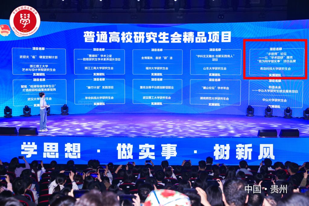 此次交流展示活动,经学校自荐、省级推报、全国遴选,共有300个项目获评“全国高校学生会组织‘我为同学做实事’优秀项目”,我校研究生会“求思得”论坛——以学术助研擦亮“我为同学做实事”项目成功入选并入围现场交流展示环节。最终,经过层层筛选、现场答辩,我校选送的项目从全国1724所高校的3581个项目中脱颖而出,荣获精品项目。