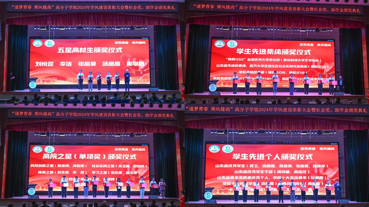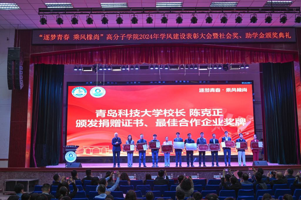 5月7日下午,高分子学院“逐梦青春 乘风橡尚”2024年学风建设表彰大会暨社会奖助学金颁奖典礼在四方校区举行。校长陈克正出席典礼,为2023年度高分子学院“五星高材生”颁奖,并为2023年度设奖助学金企业代表颁发捐赠证书、最佳合作企业奖牌。本年度社会奖助学金首次涵盖16名高密校区高材系学生。