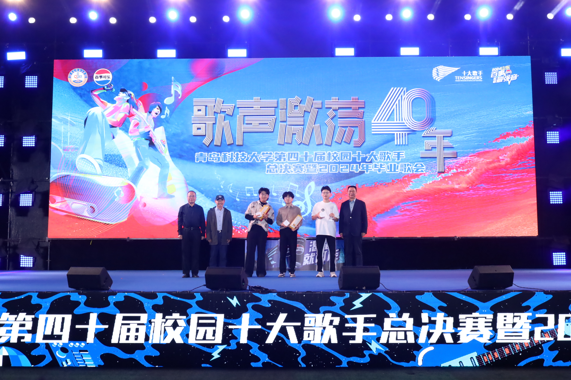 本届校园十大歌手比赛自2023年10月启动以来,共吸引了2300余名青年学生参赛,经过初赛、复赛及校区决赛的层层选拔,四方、崂山、高密、中德四个校区共有16位选手晋级总决赛。本次决赛分为组合唱及个人排位赛两轮进行,选手们激情演绎了《飞云之下》《无名的人》《天亮了》等脍炙人口的歌曲,他们用活泼欢快的音符、青春向上的旋律为毕业生们送行,用恢宏高亢的歌声点燃现场,充分展现了科大青年拥抱梦想向前飞、青春逐梦新征程的决心,唱响了“青春为中国式现代化挺膺担当”的青春主旋律。学校毕业生带来的原创歌曲《青科》将现场氛围推到高潮,用歌声表达了对母校培育的感激、对美好校园的热爱以及对学校建设发展的祝福,引发了全场大合唱。