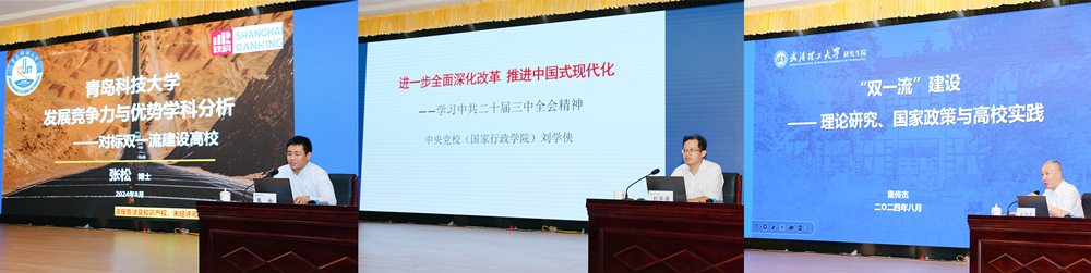 会议期间,邀请了中共中央党校(国家行政学院)刘学侠教授,围绕学习贯彻党的二十届三中全会精神作专题报告;上海软科研究院张松副院长,围绕学校发展竞争力与优势学科分析作专题报告;武汉理工大学研究生院梁传杰院长,围绕一流学科建设作专题报告。