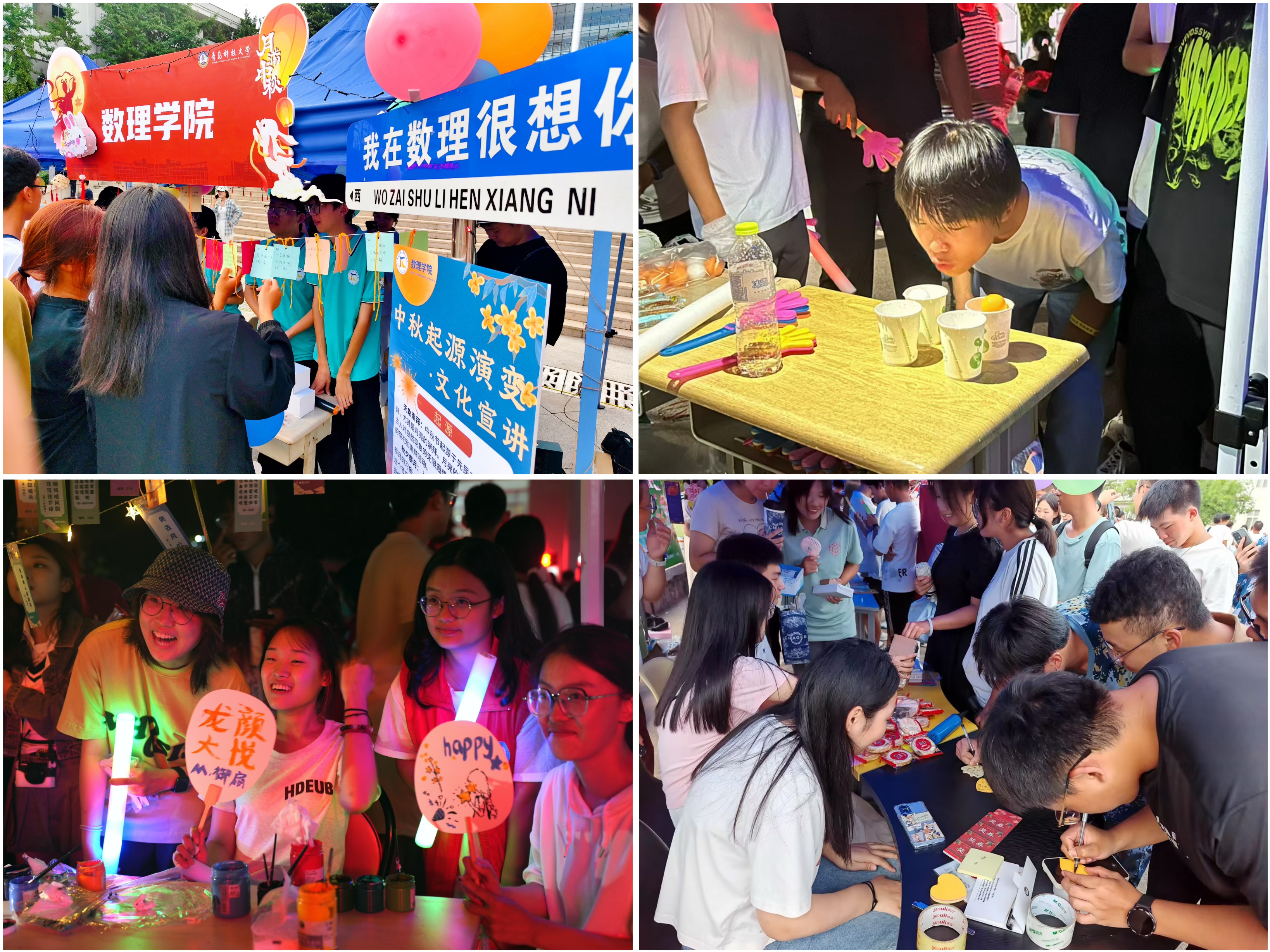 校团委、校学生会、校研究生会举办“团团邀你一起过中秋”中秋游园会,在崂山校区弘毅广场、四方校区小五四广场分别设置主题活动区,开展“灯谜映月,佳节共庆”中秋猜灯谜、“月满中秋共博趣,饼香四溢话团圆”中秋博饼、“诗意中秋话家国,我邀明月颂中华”诗词飞花令、“时刻定格,情溢科大”中秋节拍照打卡等活动,用青年学生喜闻乐见的形式弘扬优秀传统文化,营造活泼欢乐、温情有趣的校园氛围。同时,组织各院级团组织、学生会组织以及学生社团结合自身特色开展主题中秋活动,大学生艺术团带来的动感音乐、青春舞蹈,各活动区开展的做彩灯、掷飞镖、赠月饼等小游戏,让青春校园里充满欢声笑语。