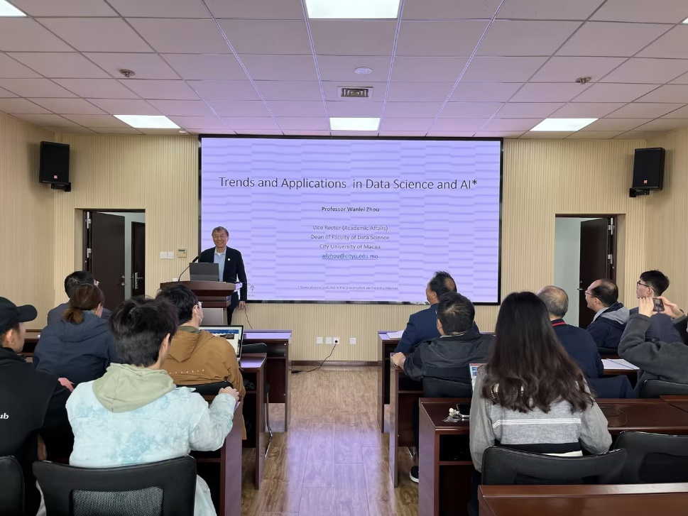 座谈会前,周万雷到数据科学学院与学院领导和教师代表围绕学院发展、学科建设等方面展开深入交流。周万雷还受邀参加了学校发展规划与学科建设处举办的“学科交叉学者沙龙”交流活动,他针对数据科学和人工智能的跨学科属性、未来发展趋势及其在全球范围内的广泛应用等方面作了题为《Trends and Applications in Data Science and Al*》的报告,活动由校务委员、发展规划与学科建设处处长聂广明主持。