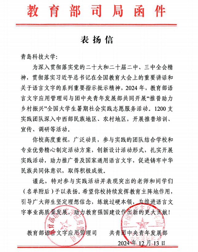 近日,学校收到了来自教育部语言文字应用管理司与共青团中央青年发展部联合发来的表扬信,对学校在2024年“推普助力乡村振兴”全国大学生暑期社会实践志愿服务活动中的突出表现给予了高度评价,并对表现突出的师生团队进行了表扬。
