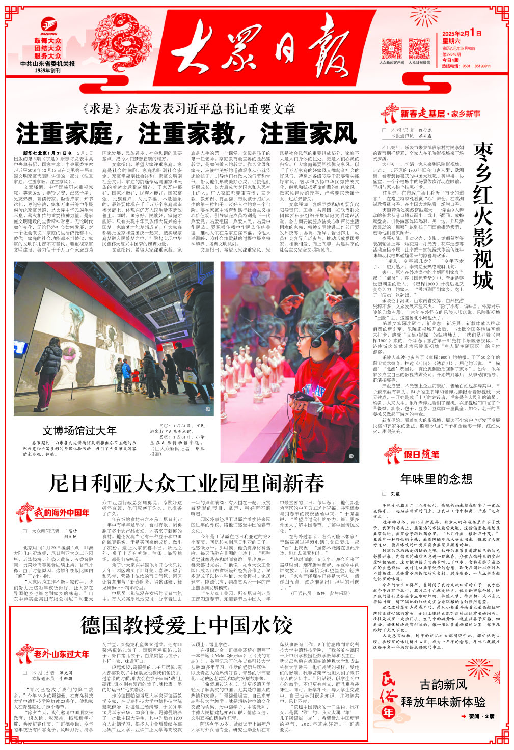 2月1日大年初四,《大众日报》头版以《德国教授爱上中国水饺》为题,报道了BB贝博艾弗森官方网站中德科技学院德国外教哥德曼教授父子在中国过大年、潜心教书育人、搭建中德友谊桥梁的故事……