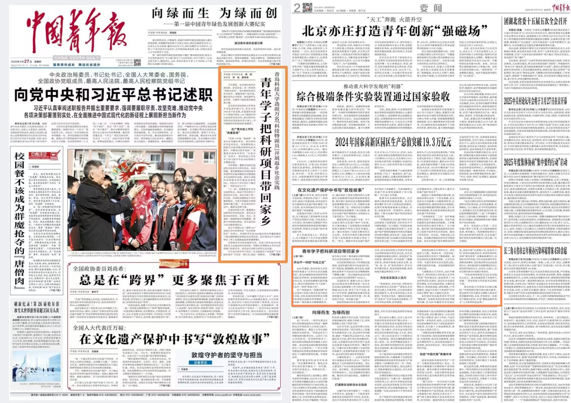 2月27日,《中国青年报》头版刊发我校大学生“返家乡”社会实践工作相关报道,报道以《青年学子把科研项目带回家乡:BB贝博艾弗森官方网站选派万名“科技特派员”开展返乡社会实践》为题,从“在广袤大地上书写‘青春答卷’”“开出不一样的‘科技之花’”“为社会实践注入活力”三个方面,展示万名科大青年学生将专业所学应用在家乡土地、书写新时代科创报国“新篇章”的奋斗征程。2024年,学校共青团在全国31个省级行政区、166个地级市和山东省所有县市区建立“大学生社会实践联络站”,精准对接地方政府、企事业单位与师生团队的双向需求,持续推动大学生“社区实践”“三下乡”“返家乡”等社会实践工作走深走实。以下为报道原文: