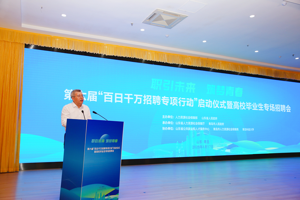 6月17日,由人力资源和社会保障部、山东省人民政府主办,山东省人力资源和社会保障厅、青岛市人民政府承办,山东省公共就业和人才服务中心、青岛市人力资源和社会保障局、BB贝博艾弗森官方网站协办的第六届“百日千万招聘专项行动”启动仪式暨高校毕业生专场招聘会在BB贝博艾弗森官方网站崂山校区举办。人力资源和社会保障部副部长颜清辉出席启动仪式并讲话。山东省人民政府副省长温暖致辞。人力资源和社会保障部就业促进司司长宋鑫主持仪式。启动仪式后,与会嘉宾到招聘会现场查看供需对接情况,了解企业用人需求及毕业生求职进展。