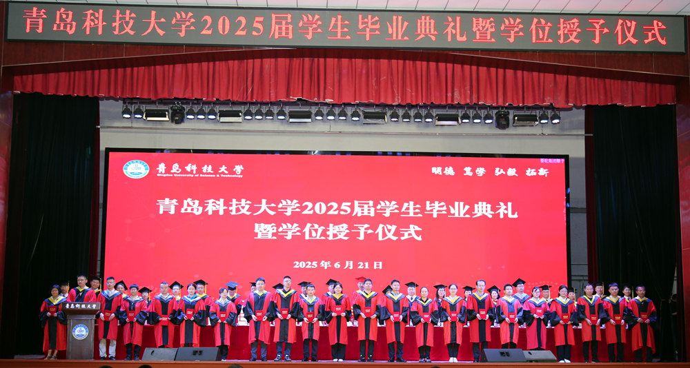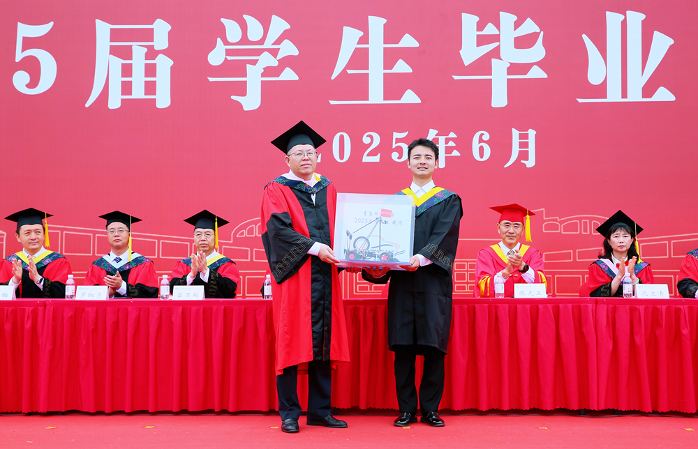 毕业典礼在雄壮的国歌声中拉开帷幕。党委书记杨天梅代表学校接受毕业生赠送给学校的智能车“智行者1号”、纸雕作品《穰程之秀 焕然新生》、插图艺术作品《龙虎啸瑞》,并向毕业生代表回赠橡胶材料3D模型“哪吒”、帆船模型“青科大01”、“青春为中国式现代化挺膺担当”纪念卡。