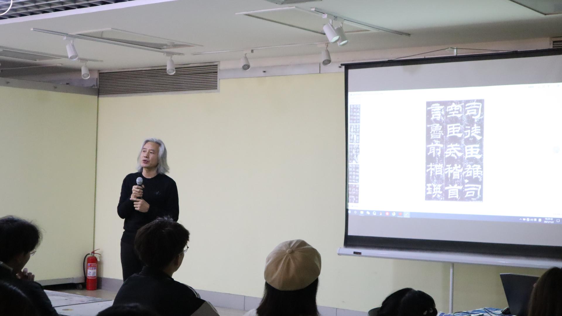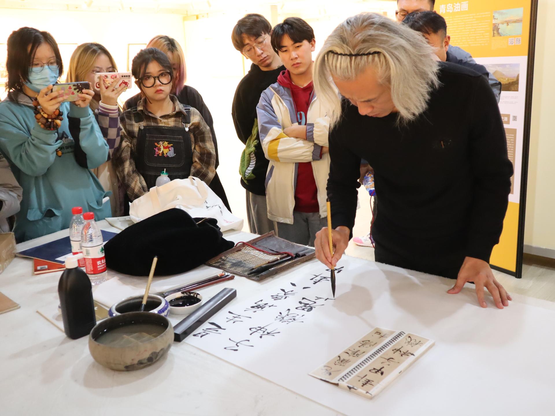 曲兴强讲到书法作为中华文化的重要载体,它传承着历史,牵连着未来。引领和开启新时代书法艺术的新气象、新境界,是每一位书法工作者的责任与使命。他从哲学的角度,深刻阐述了哲学与艺术、哲学与书法的关系;从审美的角度,系统讲解了中国书法的发展历史,介绍多种中国书法书体及其发展概况与各书体之间欣赏方法的异同;从人生的角度,充分分析了书法与人生的关系。讲座结束后,曲兴强现场解答了同学们在学习书法中遇到的问题,并进行了现场示范。