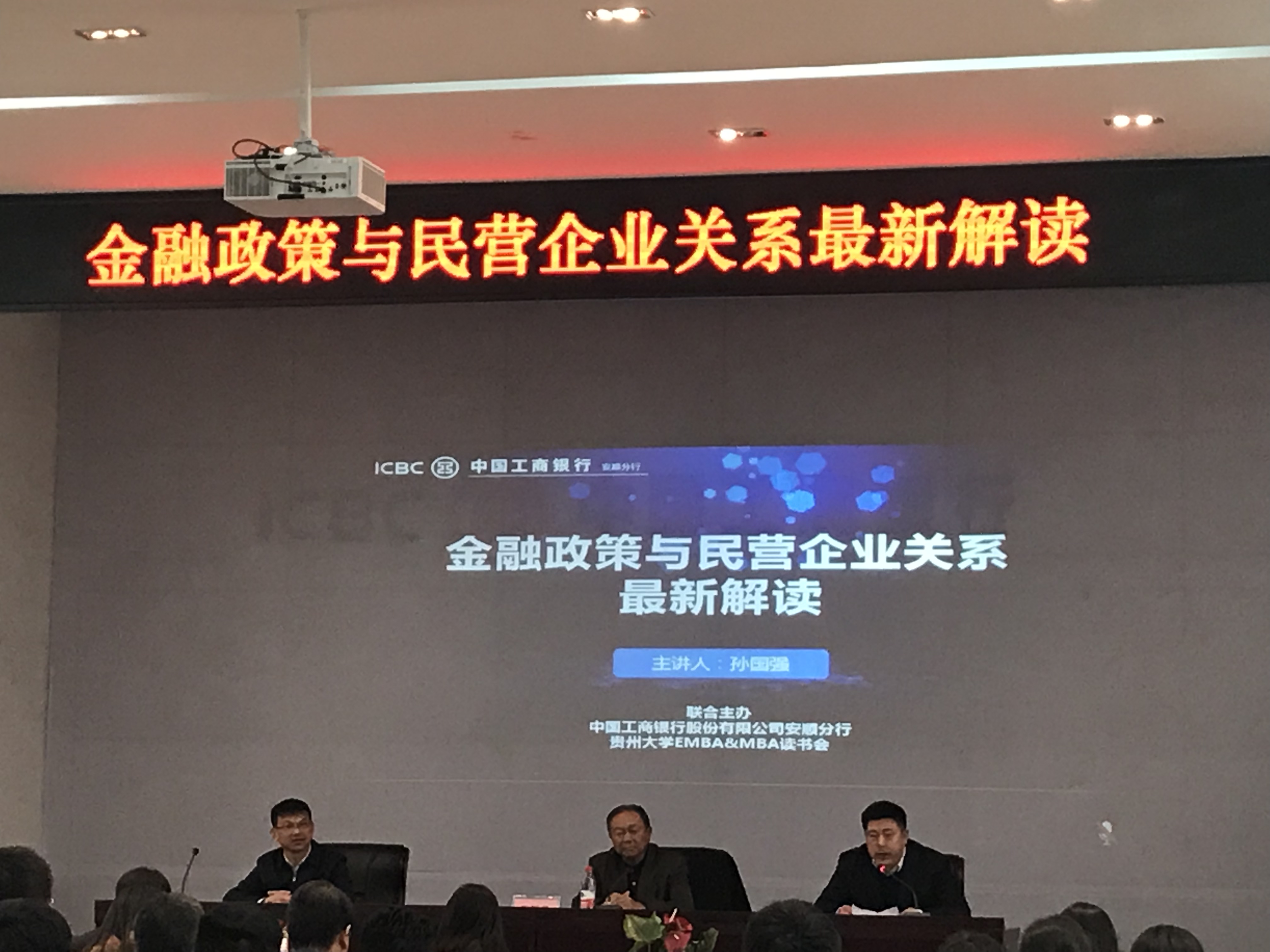 看望完红星化工的校友后,青科大贵州校友会一行应工商银行安顺分行、贵州大学的共同邀请,出席当天下午在安顺市政府组织前贵州省副省长、现贵州大学博士生导师孙国强做的题为《金融政策与民营企业关系最新解读》的大型讲座,孙教授着重站在民营企业的角度,从商品与资本的关系,虚拟经济与实体轻济的关系,投资与融资的关系、银行借贷和企业的发展等方面对当下民营企业发展中遇到的问题进行了深入剖析,演讲深入浅出,视角独特,观点新颖,为民营企业的发展提出了意见及建议。