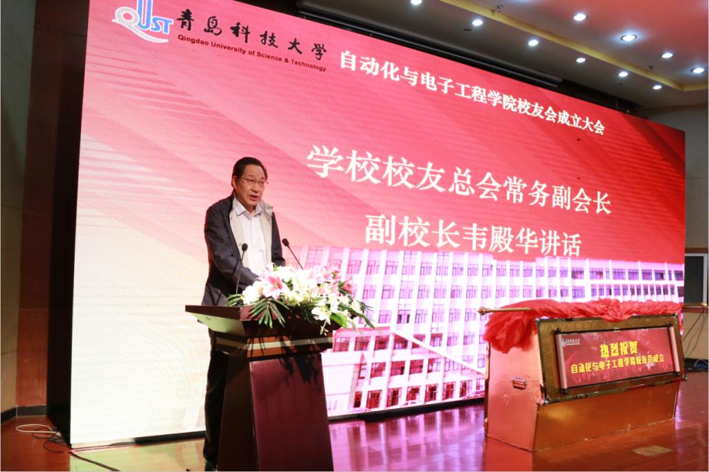 副校长、校友总会常务副会长韦殿华在大会上讲话。他指出,自动化学院校友会的成立,搭建了校友与母校、校友与校友之间交流合作的平台,也搭建了学院与校友共谋发展、服务社会的平台,是学校校友工作的一件幸事,希望广大校友与母校加强交流、密切合作,在提高人才培养质量、服务区域经济发展等方面贡献力量。