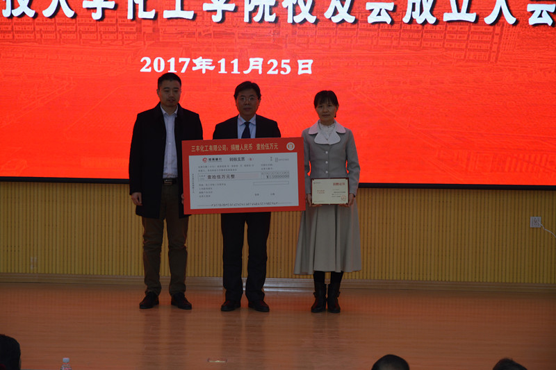 会上,刘福胜介绍了学院成立以来取得的成就和未来一段时期的发展愿景。孙明媚汇报了学院校友会筹备工作情况。化工学院校友会代表、新华制药股份有限公司副总经理杜德清代表广大校友发言。韦殿华、杜德清、张景宏、陈永柱、刘福胜、钱翌共同按启启动球,化工学院校友会正式成立。化工96届校友代表宣宗伟、美瑞新材料股份有限公司总经理王仁鸿、临沂市三丰化工有限公司研发部主任付建英为化工学院捐赠学生奖助学金。